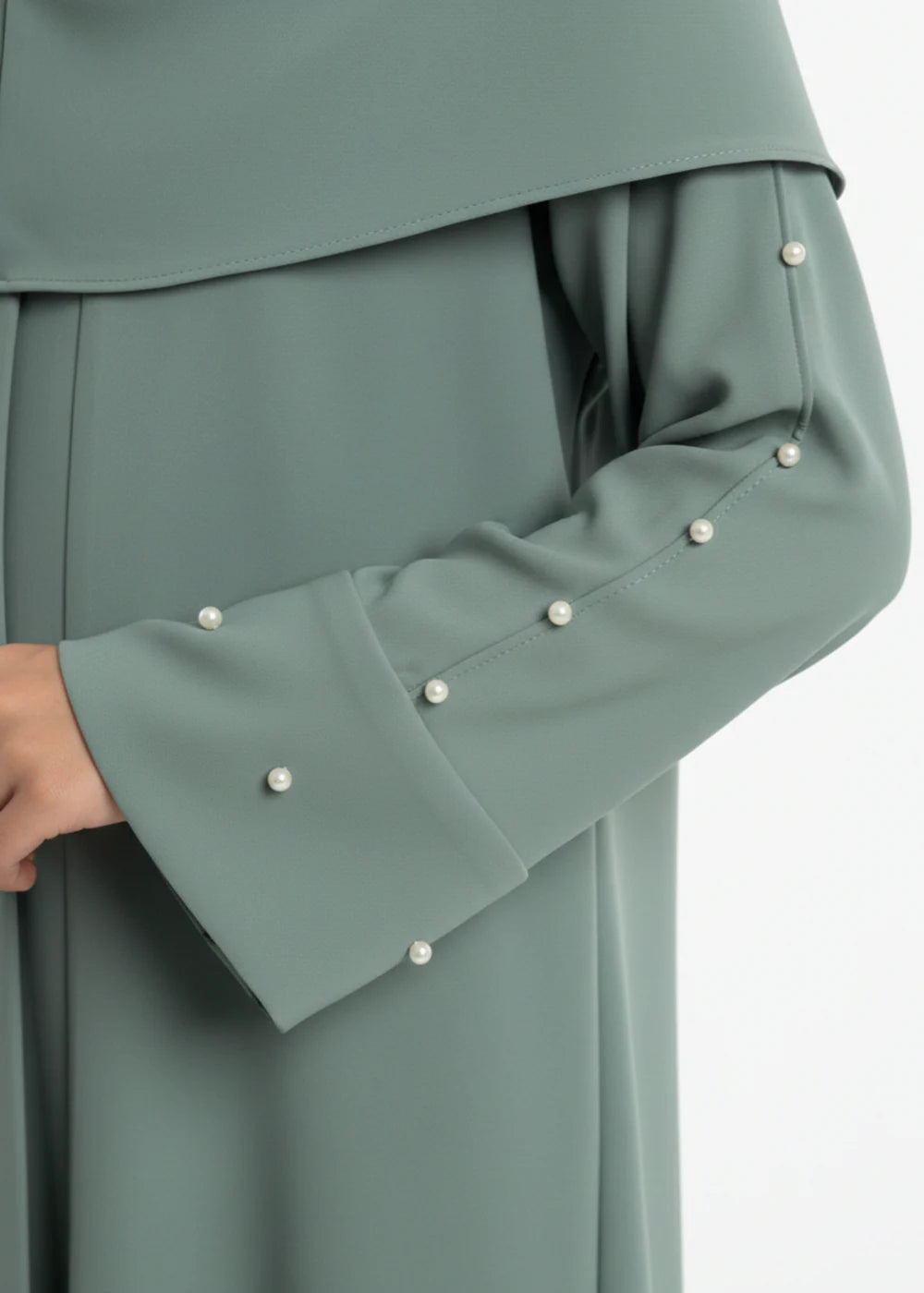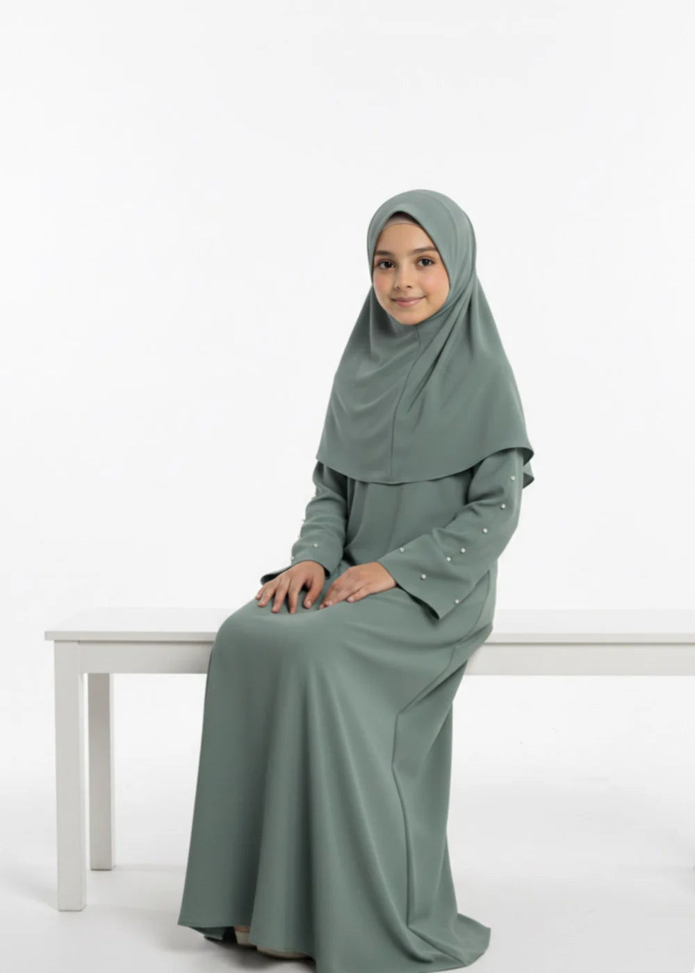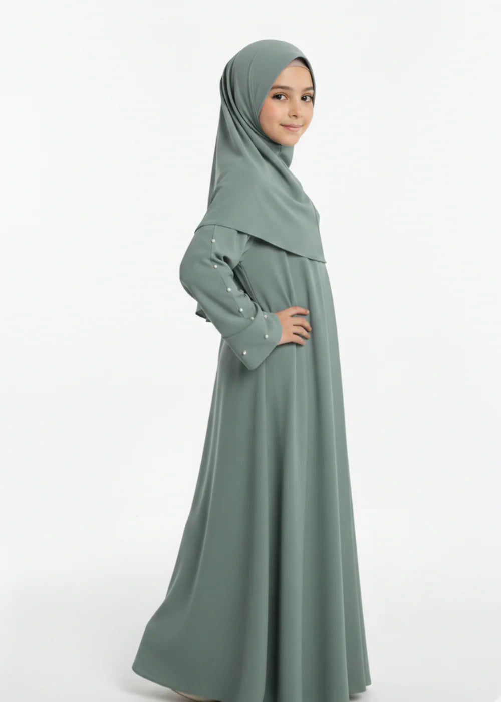 The highlight of this abaya is its delicately embellished sleeves, featuring small pearl details that add a soft, sophisticated charm. The straight-cut, full-length silhouette maintains a modest and timeless look, making it perfect for special occasions, gatherings, or elegant everyday wear. Paired with a matching hijab, this abaya offers a graceful and polished appearance for young girls.