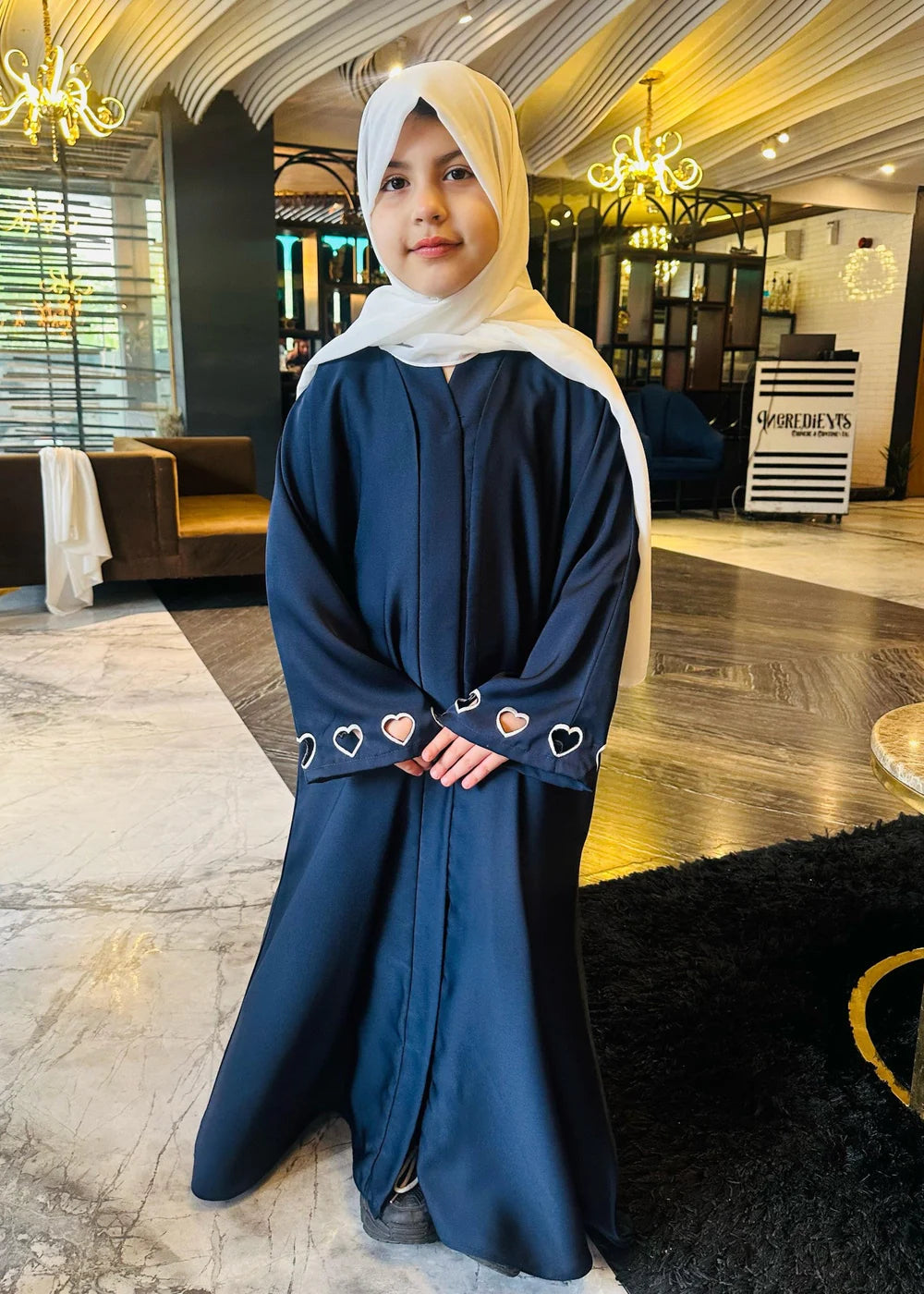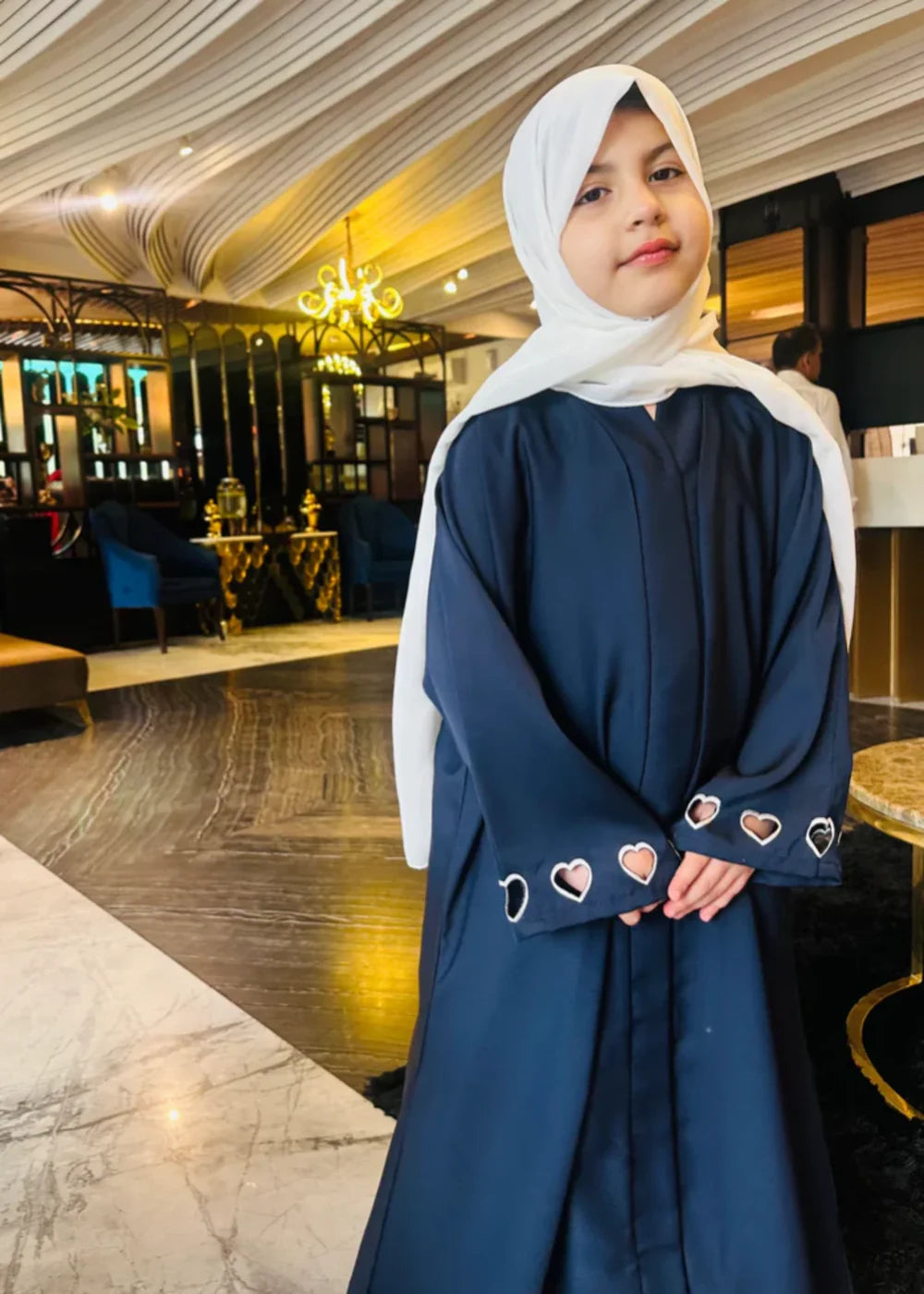 This deep blue abaya features elegant silver heart embellishments near the cuffs, paired with a crisp white headscarf for a refined, modern look. Ideal for upscale occasions with a touch of playful charm.